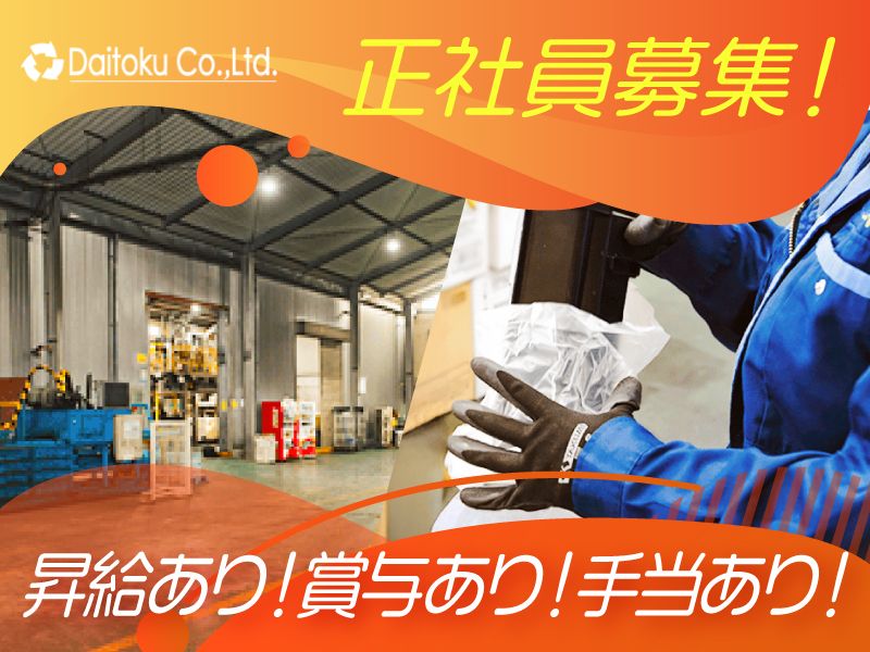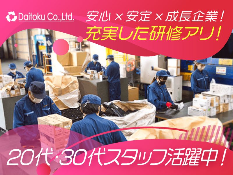 仕事内容: \家族の時間も大切に。未経験から安定した働き方!/ 女性の機械オペレーターも在籍しており、指導も丁寧! 安心してお仕事ができる環境が整っています◎ ꕤ「家族との時間を大事にしたい」 ꕤ「コツコツできる仕事が向いている」 ── そんな方にピッタリ!! 【リサイクル工場スタッフ】です。 環境にやさしい“リサイクル”を支えるお仕事。 工場内で、資源を再利用できるように分別・整える作業をお願いします。 ⭐主な業務内容 * 機械への原料投入や稼働サポート(プラスチック類の仕分けなど) * 加工後の製品を袋詰め・整理・運搬 * 機械周辺や作業エリアの清掃・整頓 先輩スタッフがマンツーマンで教えてくれるので、 未経験でも“ボタンを押す・袋をまとめる”など簡単な作業から安心スタート! 重たい荷物はほとんどなく、男女どちらも活躍しています。 ⭐ダイトクについて 創業40年以上の安定企業として、 廃プラスチックや金属などの再資源化を通じて、環境にやさしい循環型社会の実現に貢献しています。 若手~ベテランまで幅広く活躍中! ▶ 詳しくはHPへ:https://www.daitoku-s.com/company/base/