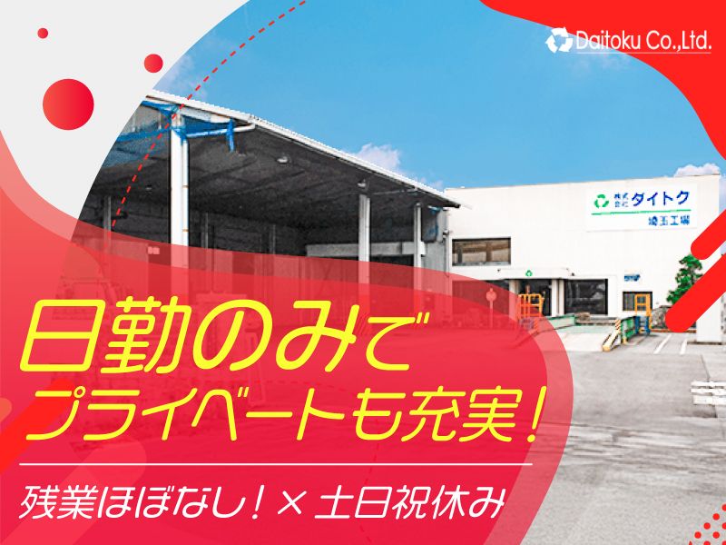 勤務地: 株式会社ダイトク 埼玉工場 埼玉県加須市栄496-1 ※転勤なし ※屋内禁煙(喫煙所あり)