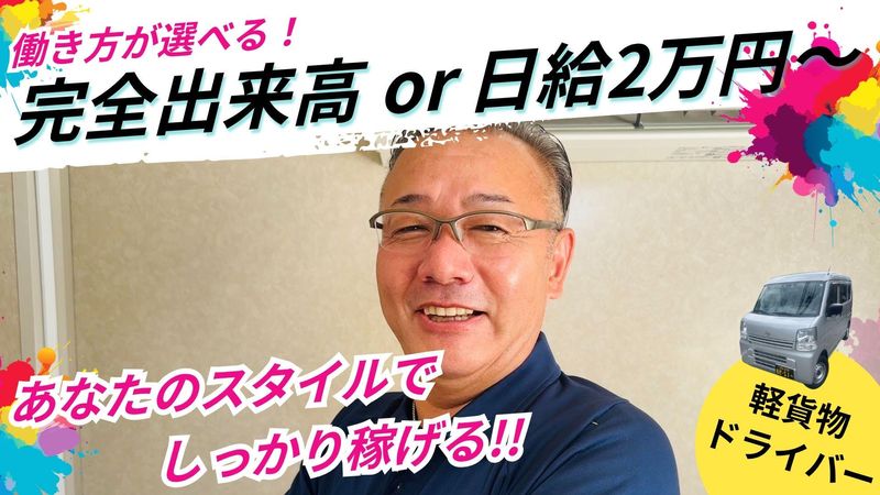 日給20,000円以上 給与詳細 基本給:日給 2万円 〜 【一律手当】 全員に一律で支払われる通勤・皆勤・家族手当金額:なし 全員に一律で支払われるその他手当金額:なし 給与に関しては選択可能! ⏩頑張った分だけ稼げる歩合制型 完全出来高制 月収50万円以上可能です!! ⏩決まった額の日給の安定制型 日給2万円~ 配送物により単価が変わります。 面接時にお気軽にご相談下さい♪ ※ご希望の働き方は、 面接時にご相談頂けたら幸いです♪