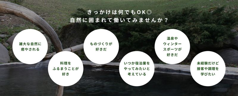 アピールポイント 【 入社後の研修体制 】 入社後は、厨房での仕込みや 配膳など調理に関わる事から 始めて頂きます。 配膳・接客・掃除など、 おもてなしに関わる大事な部分についても 先輩スタッフが丁寧に教えてくれるので、 未経験でも安心です。 【 充実した福利厚生 】 ✅温泉入浴無料(ナトリウム塩化物炭酸水素塩温泉) ✅各種社割有り:ご家族ご親族宿泊、売店購入、レンタカーなど ★希望者は山菜や野草を取りに行ったりも出来ます。 ★ウインタースポーツや登山、釣り、野鳥、DIYが好きな方歓迎。