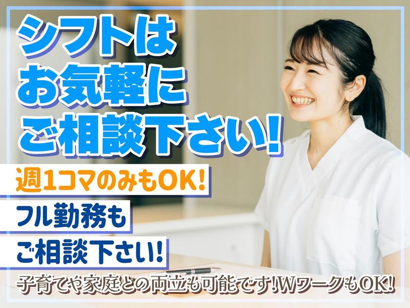 シフト制 勤務時間詳細 ◆午前診/9:00~12:00 ◆午後診/16:00~19:00 ◆曜日による ※月曜日は、午前・午後 ※水曜日は、午前 ※木曜日は、午後 ※土曜日は、午前 ※日曜日は、午前 ◎週1コマ~相談OK! ◎週1コマのみ勤務も可能! ◎WワークOK! ◎勤務曜日も幅広く対応可能! ◎午前のみ、午後のみも相談OK!