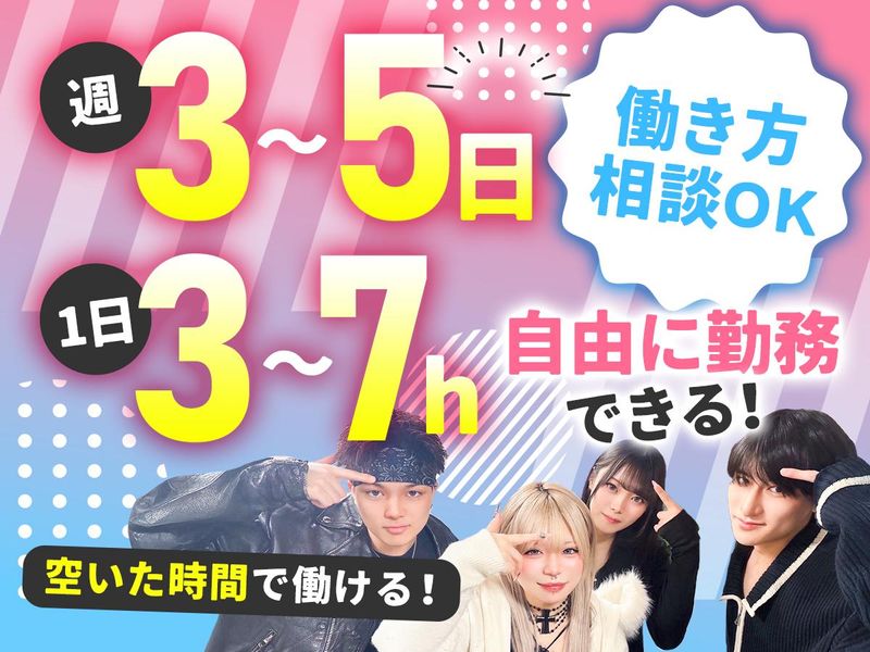 勤務時間詳細 12:00~21:00の間で週3日~5日、1日3h~7hで自由に勤務OK! *1ヶ月ごとのシフト制 *フルタイム勤務勤務歓迎 *Wワーク歓迎 働き方は相談しながら決めましょう! 「短時間勤務」「土日祝休み」 「扶養内勤務」「平日/土日のみ」 …など、お気軽にご相談ください。 「初めてのアルバイトだから少しずつ慣らしたい」 「正社員並みにバリバリ頑張りたい」 など、あなたの理想の働き方をお聞かせください。