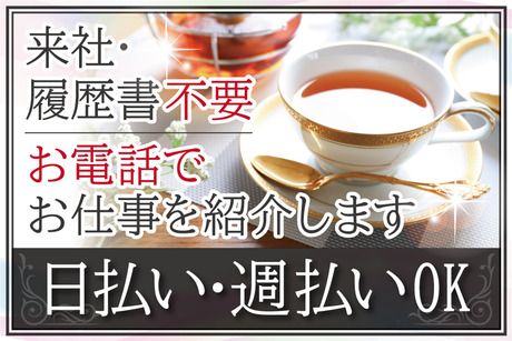 仕事内容 ■パリで創業した紅茶専門店での接客販売 <フランス流の紅茶芸術を楽しめるお店♪> 扱う紅茶は20~50種類ほどあり、 香りや味わいにこだわった上質なラインナップ。 紅茶好きのお客様が多めです◎ 「好みを聞いてぴったりの一杯をおすすめする」 そんな接客スタイルが特徴です。 【 お仕事内容 】 ・お客様対応、レジ、商品の品出し ・テイクアウト用のお茶の作成 ・開店準備(掃除・準備など) ・ギフト用の包装 ■百貨店等でレジ業務経験がある方歓迎♪紅茶が好きな方にオススメ! 紅茶の知識は不問◎研修でしっかり学べます! 「接客経験を活かしたい」 「美味しい紅茶の淹れ方を知りたい」 「茶葉の種類について学びたい」 そんな意欲がある方は大歓迎! その場にいるだけで気持ちが高揚するような フレンチスタイルのエレガントなお店で 働けるのもポイントのひとつ♪ ★20~50代のスタッフ活躍中! 男女問わず大歓迎♪ お店の雰囲気に合った服装なら、私服もOK! オシャレも楽しみながら働けます。 ■フルタイムでしっかり稼ぎたい方にピッタリ♪ 「週4日」or「週5日」で働けます◎ 時間帯はシフトによって変わりますが、 高時給1600円×実働8時間でしっかり稼げます! また、駅チカで通勤しやすい勤務地です◎ 交通費全額支給なのも安心♪ 帰りにショッピングしたり、食事したりなどの 利便性も抜群です! ■来社&履歴書不要!電話でお仕事のご紹介が可能です 応募後、まずはこちらから電話でご連絡いたします。 その際にご都合が良い日時をお伝えいただければ その日時に改めて電話で連絡いたします。 家事の合間や仕事が休みの日など、 あなたの都合のよいタイミングをお伝え下さい。 お電話で業務内容の説明やあなたの希望をおうかがいしたうえで 希望のお仕事をご案内いたします。