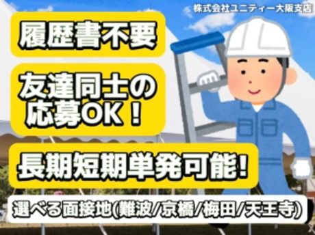 選考プロセス \面接はWEBで行っておりますので来社不要です!/ ご応募いただきましたら、メールにてWEB面接のURLを送らせていただきますので エントリーよろしくお願いいたします(^^♪ ※営業時間外の応募は翌朝のご連絡(メール)になりますのでご了承ください。 ☆お仕事開始まで☆ 当サイトにて応募→動画視聴(約8分)→質問3問(エントリー)→質問20問(WEB面接)→同意書・契約書記入→勤務開始!! WEB面接はお好きな時間にご対応いただけますが、 募集には定員がございますので早めのご対応をおススメします!! ご不明な点がございましたら、いつでもお問い合わせください。 株式会社ユニティー大阪支店 採用担当【対応可能時間/10:00-19:00】 TEL:06-6633-9244 住所:大阪府大阪市浪速区元町1-11-20 ユニティービル3F 【問合せ先について】 問合せ先:06-6633-9244 【京橋営業所】大阪市都島区東野田町4-7-26和光京橋ビル3F 【梅田駅前営業所】大阪市北区堂山町18-3オオツジ堂山ビル10F 【阿倍野営業所】大阪市阿倍野区阿倍野筋2-1-37東陽ビル7F
