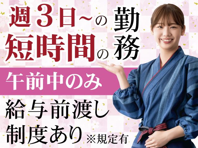 仕事内容 <アピールポイント> ・未経験OK ・給与前渡し制度あり(規定あり) ・週3日~の勤務 ・勤務時間の相談OK ・午前のみの短時間勤務(6:30~10:00) <お仕事内容> 温泉旅館で、朝食の配膳・下膳やお部屋の清掃などをお任せします。 どれも決められた流れに沿って進められる作業が多く、難しい業務はありません。 旅館ならではの落ち着いた雰囲気の中で、 20代~50代まで幅広い年代が協力しながら働いています! <未経験OK> お料理の運び方・片付けの段取り・清掃のコツなど、 先輩スタッフが一から丁寧にお教えします。 最初はできる範囲の作業からお任せするため、 旅館勤務や接客業が初めての方でも安心してスタートできます! 特別な経験や資格は必要ありません。 <朝だけ働きたい方にぴったり> 勤務時間は午前中だけの短時間シフトです。 ・午後は自分の時間をしっかり確保したい方 ・副業やWワークで少し収入を増やしたい方 など、さまざまなライフスタイルに合わせて働けます! 住み込みでのフルタイム勤務や週5日勤務などの相談可能! お気軽にご相談ください。 <魅力ポイント> 午前中だけの短時間勤務だから、午後は自分の時間に! 買い物・趣味の時間・Wワーク・家事との両立など、 ライフスタイルに合わせて働けます。 住み込み寮を無料で利用可能 生活費を抑えたい方や、環境を変えて働きたい方にもピッタリ。 旅館ならではの落ち着いた雰囲気 せかせかした職場ではなく、落ち着いた雰囲気の中で丁寧に働ける環境です。 <給与前渡し制度あり> 上限10万円まで対応可能で、急な出費があった時にも安心して働けます! 新規事務所開設にあたり応募・面接で QUOカード500円プレゼントキャンペーン実施中! ※規定有