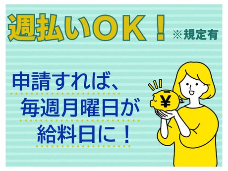 【保険制度】 雇用保険、労災保険、健康保険、厚生年金 待遇・福利厚生 【福利厚生】 ■交通費全額支給(会社規定あり) ■制服貸与 ■週払い可(規定) ■昇給あり(年1回) ■賞与あり(年2回/8月・12月) ■退職金制度(会社規定による) ■車通勤OK ■無料駐車場あり ■有給休暇 ■慶弔休暇 ■育児休暇 ■介護休暇 ■無料送迎あり ■鍵付き個人ロッカー完備 ■健康診断実施(会社負担)