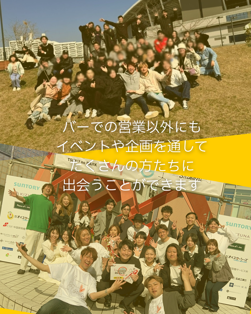 アピールポイント: ・分煙で働きやすい環境 ・おしゃれで落ち着いた雰囲気 ・服装、髪型、ネイル自由 ・未経験からスタート可能 ・バー経験者歓迎 ・他店舗とのイベントなど、楽しみながら働ける環境 ・自分らしい接客ができる職場です 接客だけでなく、SNS投稿やイベント企画など、 「やってみたい」を形にできる環境です。 自分らしいアイディアを活かしながら働けます。