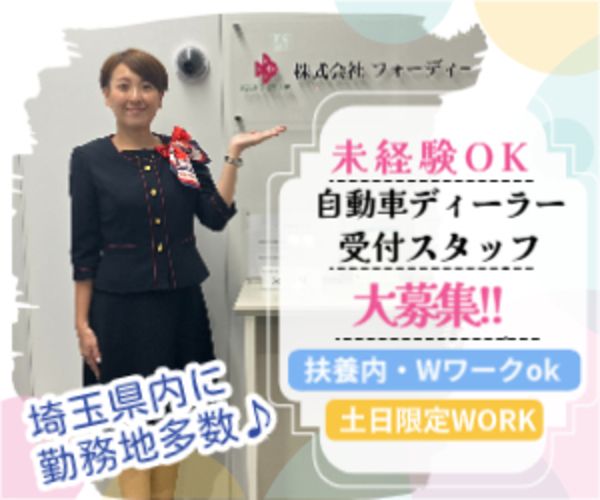 仕事内容 ❤️大手国産車販売店のショールーム受付スタッフ募集❤️ 埼玉県内に約40店舗ございます。 ご希望の店舗や通勤可能なエリアをご相談ください◎ //////////////////// ✨ お仕事内容 ✨ /////////////////// ご来店されたお客様のお出迎えとお見送り、ドリンクの提供がメインのお仕事になります! お客様が当店を選んでよかったと思ってもらえるよう、サポートしていただくお仕事です♪ 【一日の流れ(例)】 *お客様第一なので、ご来店された方への受付やご案内、ドリンクの提供を優先!! その他の時間は、ショールーム内の備品チェック・補充・掃除等をお願いします♪ 10:00 出勤後は店舗の方へ挨拶後、引継ぎノートをチェック! お客様のお出迎え(10時に来店されるお客様が多いです) ドリンクの補充や、お茶菓子やお子様用のお菓子の在庫確認 10:30 トイレのチェック(洗面台や鏡のチェック) トイレットペーパーやペーパータオルの補充 11:00 ショールーム内の清掃やチェック 12:00 お昼休憩 13:00 トイレのチェック(トイレ周りや洗面台に水がはねていないか?等) 15:00 お客様がお帰りになった後の片付け 16:00 その日の来客数を集計して店舗の方へ報告 植木の水やり、キッズコーナーやショールーム内の掃除 17:00 ドリンクサーバーの洗浄、トイレや灰皿等のゴミを集めてゴミ捨て 18:00 店舗の方へ挨拶して着替えて帰宅! 「お疲れ様でした♪」 お客様が多い日は、なかなか掃除が出来ない時もありますが、 気持ちよく過ごしていただけるように気配りをしながらお仕事をお願いします♪ 経験がない方も初日はベテランスタッフさんのサポートもあり、 分からないことはすぐに聞ける環境なので安心してお仕事が出来ます! ///////////////////////// ✨この求人のポイント✨ ///////////////////////// ①知識や経験は問いません! 運転業務やPC作業はございません。 車の知識がなくても未経験からスタート出来ます。 先輩スタッフさんのOJT研修もあるので安心♪ ②制服あり! ネイビー色のかわいい制服貸与あり(7号から15号) ③あなたの最寄りで登録! ご応募いただいたら、WEBもしくは担当者が出張にて登録手続きを行います。 土日の登録も承っておりますので、すぐに働き始めたい方にもピッタリ! 「もう少し詳細が聞きたい!」 「他にも応募しているけど大丈夫かな?」 「実際に現場を見てみたい!」 少しでもご興味持っていただけましたら是非お気軽にお問合せください。 あなたからのご応募お待ちしております!