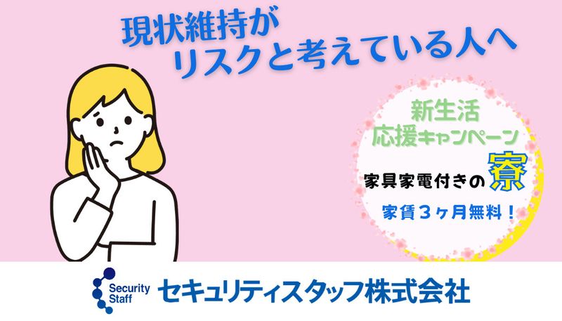 【仕事内容】 【具体的な仕事内容】 工事現場にて、安全を確保するお仕事です。 ■車の通行誘導 ■車両の出入りのサポート ■安全確保のための歩行者へのお声掛け など ※勤務場所と勤務内容は現場により異なります。 【警備員募集】 「そうだ 警備員、やろう!」のCMでお馴染み。 セキュリティスタッフ株式会社にて、 警備員を募集いたします。 「即面接、最短1日以内のスピード採用」 を実現する当社。 安定した新しいキャリアを、スピード感を持って全力でサポートします! ✅履歴書不要、WEB面接も可能! ✅面接交通費支給(¥1,000~¥2,000) ✅ご応募いただいた方と全員面接実施中! ✅入社日の相談可 ✅出張面接もOK! ※規定あり 【入社時プレゼントを贈呈中!】 下記より1つお好きな特典をプレゼントします! ・寮費3ヶ月無料 ・原付プレゼント ・車購入費用10万円補助 ・車検費用負担 ==================== 理想の職場を追求しています! ==================== 長く安定したキャリアを築いていただけるよう、 働きやすい環境の整備には力を入れています。 ✅直行直帰可! ✅現場が早く終わっても日給保証 ✅3ヶ月に1度、給与UPや昇格のチャンスあり! ✅全額会社負担で資格取得可能 ✅家具家電完備の寮に即入寮可! ✅最新のスマホを貸与 スマホで出退勤管理や位置確認が可能です! など、上記はほんの一例です。 ========================= ⭐数字で見るセキュリティスタッフ ========================= 一般隊員の最高月給 :33万円 最短終了現場 :5分(日給保証) 面接から入寮までの最短時間:1時間 最短昇給 :4ヶ月 最短隊長抜擢 :3ヶ月 最年少隊員 :18歳 最高齢隊員 :84歳 出戻り人数 :18人 交通誘導2級資格最短取得 :4ヶ月 公共事業と民間事業の警備業務の割合は50:50。 閑散期がなく年間を通じて安定して稼ぐことが可能です! 新たなキャリアへの第一歩を、 早速踏み出してみませんか。 ぜひご気軽にお問い合わせくださいね! 【求人ID-SKJ】
