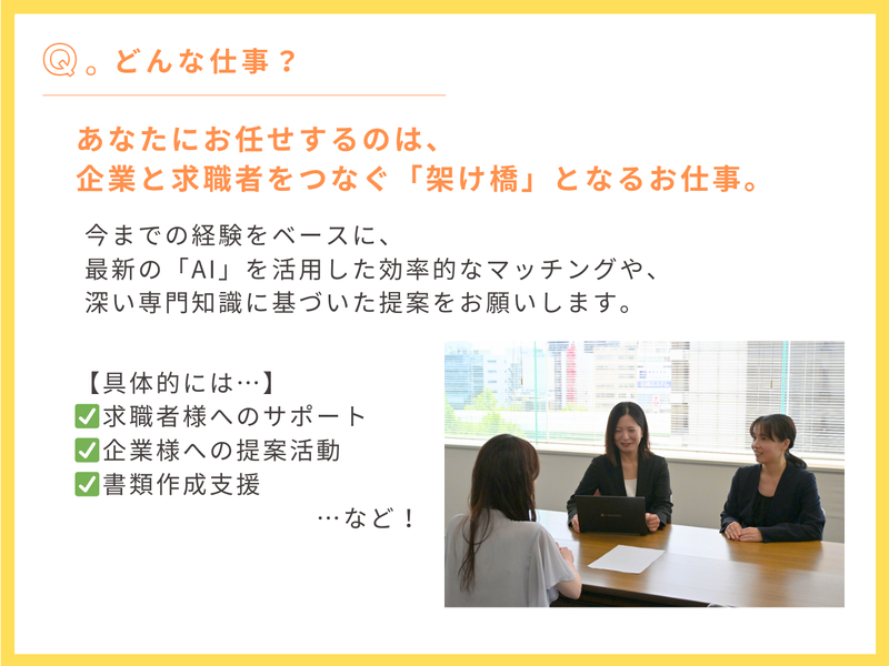 仕事内容 *‥‥*‥ アピールポイント ‥*‥‥* ✨ 【安心】土日祝休み&年休120日。会社周辺の託児所探しも全力サポート! ✨ 【超柔軟】「16:50退社」「子どもの長期休みは10時出社」も可能!いざという時はリモートワークも対応◎ ✨ ノルマなし&人間関係の悩みゼロでストレスフリー ✨ 【未経験OK】「経理×AI」の5段階研修で、一生モノのスキルを習得! ✨ 【経験者優遇】早期の管理職登用や、新規事業の中核メンバーも目指せる。 *‥‥*‥‥*‥‥*‥‥*‥‥*‥‥* ┏────────────────┓ どうせ働くなら、 ただ右から左へ人を流すだけの仕事じゃなくて、 「あなただから頼みたい」と言われるプロになりたい。 でも、子育てや家庭の都合があるから、 決められた時間通りにキッチリ働くのは正直ハードルが高い…。 私たちは、そんなあなたの味方です! 当社には「子育て支援制度」といった名前の枠組みはありません。 だからこそ、一人ひとりの「〇〇だったら働けるのに!」という リアルな声に合わせて、柔軟に働き方を工夫できるのが当社の強み。 名古屋の中心・栄エリアの明るいオフィスで、 「AI活用」と「経理知識」という新しい武器を手に入れながら、 あなたらしいキャリアの第一歩を踏み出しませんか? ┗────────────────┛ ⭐ 具体的なお仕事  ̄ ̄V ̄ ̄ ̄ ̄ ̄ ̄ ̄ ̄ ̄ ̄ ̄ ̄ ̄ ̄ 企業と求職者をつなぐ「架け橋」として、 マッチングや提案業務をお任せします。 ✅ 求職者様へのカウンセリング・サポート ✅ 企業様へのニーズヒアリング・提案活動 ✅ 最新AIを活用した書類作成支援(履歴書等) ✅ 最適なマッチング・面接設定・入社フォロー ★ここがポイント! ただのマッチングで終わらないのが、この仕事の面白いところ。 ノルマに追われることは一切ありません! SNSの更新や、新しい事業を盛り上げるための追加業務など、 あなたの「こんなことやってみたい!」という企画力や提案力が どんどん活かせる環境です。 ⭐ 「制度がない」=「柔軟に相談できる」! あなたのライフスタイルにとことん寄り添います ┈┈┈┈┈┈┈┈┈┈┈┈┈┈┈┈•• ✨「出勤・退勤時間」の個別アレンジOK 「保育園のお迎えがあるから、少し早く来て16:50に帰りたい」 「子どもの夏休み中は、朝ゆっくり10時に出社したい」 そんな働き方も大歓迎!個別の事情に合わせて柔軟に対応します。 ✨ 託児所探し&リモートワークもサポート 「職場の近くに預け先があれば…」という方には、 なんと会社が一緒に託児所を探します! 子育て中の方も安心のリモートワークも可能なので、 いざという時も無理なく働き続けられます。 ⭐ 未経験でも安心の教育体制 ─────────── 座学と実践で「経理の基礎」から「最新AI の活用術」まで丁寧にレクチャー。 AIが事務作業を効率化してくれるため、未経験からでも最短14日程度で実務に慣れることが可能です。 ⏩ 1日の流れ(例) ─────────── 09:00:出社・メールチェック 10:00:企業様へ募集要件のヒアリング 12:00:ランチ(栄エリアなのでお店豊富!) 13:00:AIツールを使って候補者を検索 15:00:求職者様とWeb面談 17:00:進捗管理・明日の準備 18:00:退社(残業少なめで私生活も充実) ⭐ 採用担当からメッセージ ───────────── 現在、44歳以下の次世代メンバーを 1名限定で募集しています。 「専門性を高めたい」「柔軟な働き方を 手に入れたい」という意欲を重視。 大量採用ではなく「1名限定」の募集だからこそ、 あなたの成長やキャリアプランに、会社としてじっくり向き合います。 ✅職場見学だけでもOK!お気軽にどうぞ ▶HP:https://aoi-tokai.com/ ▶「子どもがまだ小さいのですが…」といった 働き方のご相談も、ぜひお気軽にどうぞ! ─────【当社について】───── 名古屋の中心・栄の「建設業会館」7階。 明るく開放感バツグンのオフィスです。 矢場町駅徒歩3分、デパートもすぐ近くで 仕事帰りの買い物にも便利な立地です。