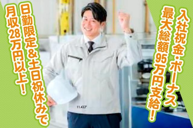 【エンジンの組立】日勤限定&土日祝休みで月収28万円以上◇入社祝金・ボーナス最大総額95万円支給 当社では、大手有名製造メーカーにてエンジン部品の 組立業務を担当いただけるスタッフを募集しています。 勤務は日勤のみで、安定した環境で働けます。 業務内容 ・エンジン部品の組立作業 ・ライン作業で流れてくる部品に、担当部品を組み付けるシンプルな工程 ・入職後は約4日間の研修で、工具の使い方などを丁寧に指導します 未経験の方も安心してスタートできます。製造や組立の経験をお持ちの方は、スキルを活かせます。 待遇・福利厚生 ・入社お祝い金・ボーナスあり(入社後3年間で総額最大95万円 ※規定あり) ・交通費全額支給 ・皆勤手当あり ・寮費補助あり ・週払い制度あり(急な出費にも対応可能) 応募について ・履歴書不要でスピード採用 ・現地面接対応可能 ・職場見学も実施 「すぐに働きたい」「安定した環境で長く働きたい」という方を 全力でサポートします。お気軽にご相談ください。