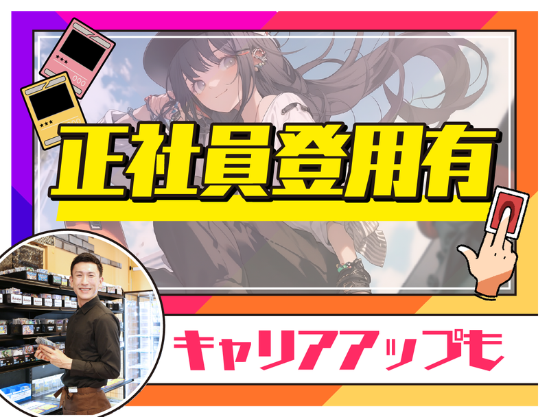 求めている人材 【必須条件】 ●週4日以上働ける方 ●土・日のいずれかに出勤できる方 ●協調性や責任感をもってお仕事できる方 【こんな方、大歓迎です】 ●接客業経験者 ●トレカショップ経験者 【もちろん未経験も歓迎です】 「昔カードゲームにハマっていた」 「好きなカルチャーの近くで働きたい」 …そんな方、大歓迎♪専門知識がなくても、研修でしっかり学べるのでご安心ください!