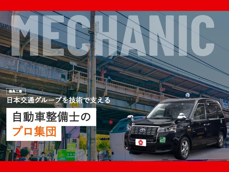 仕事内容 14年連続業界No.1である日本交通グループで活躍! 【仕事内容】 お客様と乗務員の安全を守るために欠かせない、車両を技術で支える整備士をお任せします。 日常で沢山の方が利用されるタクシー。 安心して運行できているのは、整備士の存在があるからです。 街中で日本交通のタクシーが安全に走っている姿を見る度に、自分の仕事の成果を感じることができますよ。 ★日本交通グループの整備士として働く魅力★ ◎整備の仕事に集中できる 対応する車両が決まっているため、整備士が営業する必要はありません。 関わるのはグループ内の乗務員のみ。 コツコツ整備に取り組みたい方にピッタリです。 ◎残業月5時間以下を実現! 整備するのはグループ内のタクシーやハイヤーのみ。 すでに決まったスケジュールに沿って整備を進めていくので、差し込み業務なし。 「ちょっと見てほしい」という場合もありますが、それでも残業はほとんどありません! 【入社後は】 未経験、資格が無くてもOK。 整備士に関する資格は入社後に取得可能です。 スキル・経験に応じ日本交通グループの研修担当者がマンツーマンであなたを指導。 これまでの経験などをしっかりとヒアリングし、丁寧にお教えしますのでご安心ください。 研修後は車検作業からスタート。 車検業務をひと通り覚えたら、先輩と一緒にブレーキを分解して構造を覚えたり、エンジン部品の交換、料金メーターの修理など、少しずつ学び、仕事の幅を広げていきましょう。 【キャリアアップについて】 入社後の「一般整備士」から「チーフ」→「工場長」とキャリアアップが可能。 タクシー、ハイヤーの整備を中心に整備業務を極めるのもよし、整備管理者などキャリアの幅を広げるのもOKです! 働きやすさ&キャリアの両方が揃っていることから、腰を据える先輩が多いんです。