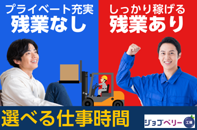 勤務時間 (1)8:00~17:00 (2)13:00~22:00 (1)か(2)のどちらか選べます。 【休憩時間】60分 【残業】希望制※有りの場合は月30~40H(生産状況により変動有)