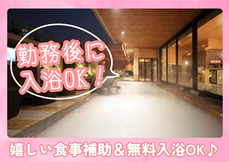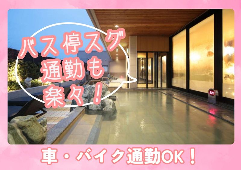 職場環境 館内は清潔感があり落ち着いた雰囲気♪受付・清掃・レストランともに複数名体制で、困った時はすぐ相談できます。未経験スタートの方も多く、安心して長く働ける環境です。勤務後は無料入浴★ 喫煙所:喫煙所あり(屋外)