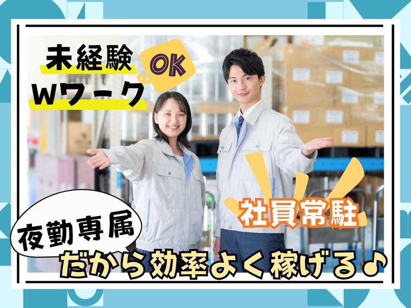 仕事内容 ✨.・.✨.・.✨.・.✨.・.✨.・.✨ 夜勤専属でしっかり稼げる! モクモク軽作業で高収入♪ 日中の時間を自由に使える働き方 ✨.・.✨.・.✨.・.✨.・.✨.・.✨ 冷蔵倉庫内でのシンプル軽作業! 未経験の方でも安心してスタートできる 「仕分け・ピッキング」中心のお仕事です。 夜勤は時給も高く、安定した収入を確保しながら 日中の時間を自由に使いたい方にピッタリ♪ <仕事内容> スーパーの店舗ごとに配達する商品を分けていくだけ◎ 重いものは少なめで、倉庫作業が初めての方でも安心。 社員が常駐しているから、困ったときはすぐにサポートします! 作業はゆっくり覚えてくれればOK。 焦らず、自分のペースで進められる環境です♪ <ここが夜勤専属のポイント!> ●高時給1300円~で深夜帯はさらに収入UP ●夜勤フルタイムで月収安定 ●日中は丸ごと自由時間(趣味・通院・家事・Wワークと両立) ●人が少なくて作業に集中しやすい静かな環境 <働きやすさもバッチリ> ・週3日~/1日4h~OK ・20~50代まで幅広く活躍 ・服装、髪型自由&ネイルOK(華美でなければ) ・WワークOK! ・希望休が通りやすく、プライベートと両立しやすい職場 ※ゴム手袋・防寒着・安全靴をご準備ください。 「どんな雰囲気?」「本当に自分でもできそう?」 少しでも気になった方は、ぜひ職場見学へ! 雰囲気を見てから応募の判断をしてOKです♪