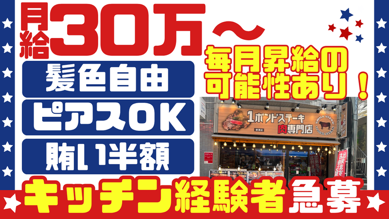 仕事内容 【 経験次第で毎月給与UP✨ 】 目の前で魅せる“焼き”の迫力! これが、エンタメ系アメリカンな専門店★ / 経験者の腕が輝くキッチンへ。 お客様の目の前で焼くスタイルが魅力! \ 1ポンドステーキ専門店で増員募集決定! お客様の目の前で焼き上げるスタイルは あなたの腕の見せ所! ※ステーキを焼いた経験がなくても お店の業態問わずキッチン経験でOK ☆┈┈┈┈┈┈┈┈┈┈┈┈┈┈┈┈┈☆ ✅ 経験者募集! スキルを評価し毎月昇給の可能性有✨ ☆┈┈┈┈┈┈┈┈┈┈┈┈┈┈┈┈┈☆ ✅ 髪型髪色・ピアスOK 飲食店でもお洒落を楽しめる!! ☆┈┈┈┈┈┈┈┈┈┈┈┈┈┈┈┈┈☆ ✅ 月給30万円スタート どんどん給与UP⤴しっかり稼げる! ☆┈┈┈┈┈┈┈┈┈┈┈┈┈┈┈┈┈☆ ✅ まかない『半額』 節約にもなると大好評なんです♬ ☆┈┈┈┈┈┈┈┈┈┈┈┈┈┈┈┈┈☆ 厳しさとは程遠い!! 楽しい×自由度高めのお店で募集決定★ *** 【若手が中心‼】活気120%! 美味いステーキは熱い現場から生まれる!  ̄V ̄ ̄ ̄ ̄ ̄ ̄ ̄ ̄ ̄ ̄ ̄ ̄ ̄ ̄ ̄ ̄ ̄ お客様の目の前で焼いていく、 アメリカンな雰囲気のステーキ専門店! ▶キッチン業務をお任せします! ・簡単な盛り付け ・ステーキを鉄板で焼く ・洗い物 など ”焼く”パフォーマンスを中心に キッチン業務全般をお願いします♪ ⭐キッチン経験者の募集になります! (お店の業界は問いません!) ⭐20代~40代の男女が活躍中! ステーキの提供はしたことがない方も 飲食店でのキッチンの経験があれば、 大丈夫です*。٩(ˊᗜˋ*)و*。 まずは当店ならではの、 お客様の「うまい!」が直接聞ける 環境を楽しんでください♪♪