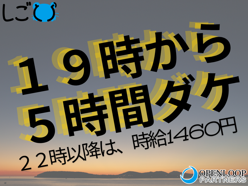 固定時間制 勤務時間詳細 【勤務時間】 19:00~0:00 【休憩時間】 なし【勤務時間備考】 実働5時間 ほぼ残業なし/月に平均0~5時間程度