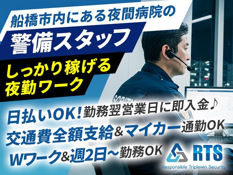 仕事内容 ――――――――――――――― 夜勤でしっかり稼ぎたい方必見! 翌日入金の日払い制度あり! ―――v――――――――――― *⭐* 仕事内容 *⭐* ━━━━━━━━ 船橋市内の病院での夜間警備・事務業務をお任せします。 ◆警備◆ ✅ 病院内の見回り、施錠・開錠 ✅ 守衛室でのモニター監視 ✅ 業者さんの出入管理 ◆事務◆ ✅ 電話対応 ✅ 窓口対応 ✅ 時間外外来受診者の受付(電子カルテ操作) ✅ 簡単なお会計(金額固定の預り金) ※簡単なパソコン操作あり ✨警備と事務を両方担当いただきます。 ✨未経験でも研修があるので安心して始められる環境が整っています。 *⭐* 注目ポイント *⭐* ━━━━━━━━━━ ✅ 未経験者歓迎!丁寧な研修制度あり ✅ 仮眠時間があるので体力的に安心 ✅ スマホで楽々!翌日入金の日払い制度あり ✅ 交通費全額支給&マイカー通勤OK ✅ 週2日~OK!シフトは柔軟に対応 *⭐* スタッフインタビュー *⭐* ━━━━━━━━━━━━━━ ✨40代・男性スタッフ 「最初は警備の仕事に不安がありましたが、 先輩スタッフが丁寧にサポートしてくれたので安心してスタートできました。 夜勤といっても仮眠時間がしっかり確保されているので、無理なく働けるのが嬉しいです。」 ✨30代・女性スタッフ 「Wワークとして始めましたが、シフトの融通が利くので自分のライフスタイルに合わせて働けます。 給与の翌日振込サービスもありがたいですね。 病院の事務作業は初めてでしたが、マニュアルを見れば分かる様になっているのでイレギュラーなことにも対応できてます。」 *⭐* 会社について *⭐* ━━━━━━━━━━ 株式会社RTSは、警備業務中の安全で快適な環境を提供する企業です。 未経験者でも安心して働けるよう、充実した研修制度を完備しています。 警備してプロフェッショナルとして活躍できる環境を整えています。 正社員登用制度もあるので、キャリアアップを目指す方にも最適です。 ~~~~~~~~~~ ※採用枠が埋まり次第、募集終了となりますので、お早めのご応募をお待ちしております!