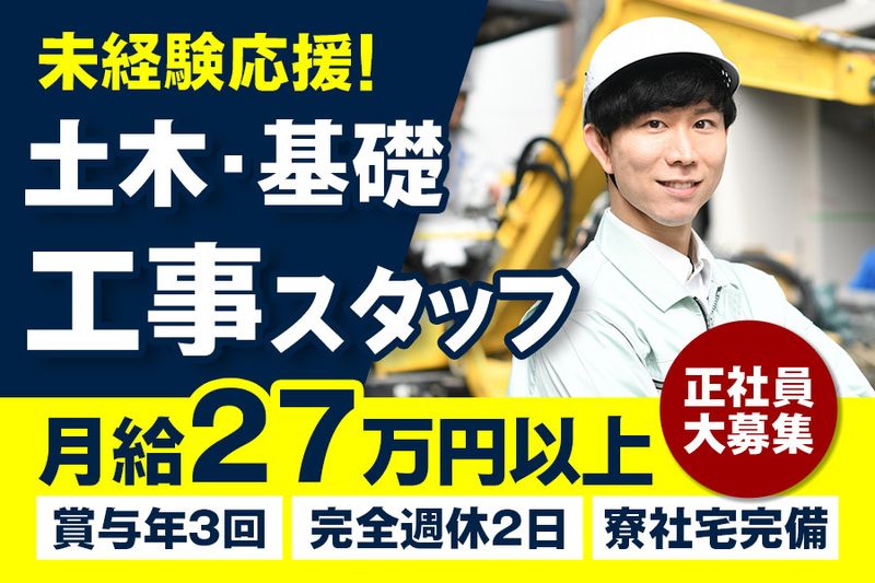 【アピールポイント】 建設土木企業で施工スタッフを正社員募集! ■未経験・高卒OK ■日給1.8万目指せる ■賞与年3回 ■完全週休2日 寮社宅完備♪