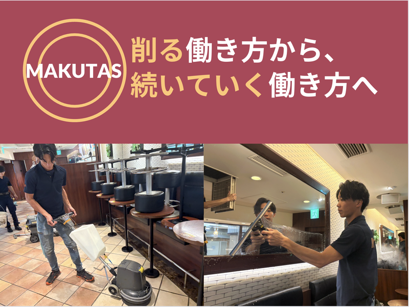 求めている人材 【未経験から月収30万円以上を目指せます】 経験やスキルは一切問いません。 「今の自分を変えたい」──その想いがあれば十分です。 【応募条件】 ・未経験OK(清掃業界の経験は一切不要!) ・学歴・職歴・転職回数すべて不問 ・普通自動車免許(AT限定可)をお持ちの方 【こんな方に向いています】 ・今の働き方にモヤモヤしている方 ・夜の時間を活かしてしっかり稼ぎたい方 ・昼は夢や家族との時間を大切にしたい方 ・安定しながらも、自分のペースで働きたい方 ・頑張った分だけ正当に評価されたい方 ・人間関係がシンプルで居心地の良い職場を探している方 【実際に活躍しているスタッフの前職】 ・テレビ業界のAD ・新聞配達員 ・ホテルスタッフ ・足場作業員・建設業 ・飲食店スタッフ ・フリーターさんなど \ほとんどが未経験スタート!/ 共通しているのは、 「このままじゃ終わりたくない」 「もっと誇れる働き方がしたい」 という前向きな想いでした。 【求める人物像】 ・やる気を持って仕事に向き合える方 ・素直に学び、吸収できる方 ・仲間と協力して現場を仕上げられる方 Makutasが大切にしているのは、 “どんな過去より、これからどう変わっていくか”。 【こんな働き方が叶います】 ・夜に集中して働き、昼は夢や家族のために時間を使う ・「今日は早く終わった!」そんな日もある柔軟な現場 ・明確な評価制度で、昇給チャンスも多数 ・チームで支え合うから、ストレスなく続けられる 【一言で言うと…】 Makutasは、 “頑張ることを無理強いしない会社”です。 コツコツ積み上げる人が、 ちゃんと評価される環境を用意しています。