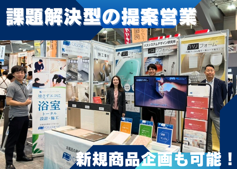 仕事内容 ▛▝▝▝▝▝▝▝▝▝▝▝▝▝▝▝▝▝▝ ▜ 独自技術「エコバスリフォーム」で 業界シェア急拡大中のベンチャー企業! 単なるモノ売りではない営業スタイル◎ ▙ ▖▖▖▖▖▖▖▖▖▖▖▖▖▖▖▖▖▖▟ \\この仕事の魅力// ==================== ⏩大手メーカーと提携し商品開発・企画も! ⏩競合がほぼいない独自技術で市場急拡大中 ⏩コロナ禍も売上年率20%以上成長を継続 ⏩土日祝休み&年間休日125日◎ ⏩入社後は営業力向上を徹底サポート! ==================== |◤ 仕事内容 ◢|  ̄ ̄ ̄ ̄ ̄ ̄ ̄ ̄ ̄ ̄ ̄ ̄ ̄ ̄ ̄ ̄ ̄ ̄ ̄ ̄ 4,000万室を超えるホテルや中古住宅の 浴室をターゲット市場とし、独自開発の 浴室改修技術「エコバスリフォーム」を 提案していただきます! 具体的には…  ̄ ̄ ̄ ̄ ̄ ̄ ̄ ⏩お客様への提案活動 └ メインは、お取引先からの 「こんなお風呂にしたい」 「困っている」という相談への対応です。 詳しくお話を聞き、 見積もりなどを作成します。 ⏩顧客との信頼関係づくり └ 商社やホームセンター、ガス会社など、 パートナー企業の担当者様と 良い関係を築きます。 「〇〇様を紹介するよ」と 言ってもらえることもあります。 ⏩商品の企画・開発 └ お客様の「こんなことできない?」 という声(ニーズ)を会社に持ち帰り、 新しいリフォーム商材の 企画や開発に携わることもできます。 ⏩技術を広める活動 └ 展示会やイベントに参加し、 まだエコバスリフォームを知らない方へ 独自の技術をアピールします。 業界をリードする急成長企業の 課題解決型営業にチャレンジしてみませんか? ●エコバスリフォームについて  ̄ ̄V ̄ ̄ ̄ ̄ ̄ ̄ ̄ ̄ ̄ ̄ ̄ ̄ 当社の「エコバスリフォーム」は、 既存浴室を解体せずに新しい浴室に 生まれ変わらせる独自工法です。 実質的に競合が少ない恵まれた市場環境 ですが、だからこそ「認知拡大と信頼構築 のための地道な活動」が重要となります。 ┏──────────────────┓ 成長を加速させる3つの働きやすい環境 ┗──────────────────┛ ✅未経験者徹底サポート!充実の教育体制  ̄ ̄ ̄ ̄ ̄ ̄ ̄ ̄ ̄ ̄ ̄ ̄ ̄ ̄ ̄ ̄ ̄ ̄ ̄ ̄ 営業・技術両面での教育体制が充実。 自社開発の映像マニュアルと、先輩社員による 習熟度別OJTにより短期間でスキルが身につきます。 また独自開発の営業・施工管理アプリを全社員が 活用し、業務の効率化を実現しています。 ✅プライベート充実!残業を減らすDX環境  ̄ ̄ ̄ ̄ ̄ ̄ ̄ ̄ ̄ ̄ ̄ ̄ ̄ ̄ ̄ ̄ ̄ ̄ ̄ ̄ 当社ではDXやAI技術の活用により、 業務効率化を進め、土日祝日の休暇確保と 残業時間の大幅削減を実現。 プライベートと仕事のバランスを大切に できる環境づくりに取り組んでいます。 ✅成長企業でのやりがい  ̄ ̄ ̄ ̄ ̄ ̄ ̄ ̄ ̄ ̄ ̄ ̄ ̄ ̄ ̄ ̄ ̄ ̄ ̄ ̄ コロナ禍を含む過去5年間で、売上高は 年率20%以上の伸びを記録。 主にBtoBビジネスとして「建設会社」 「リフォーム会社」「住宅資材商社」との 取引を基盤としつつ、大手ホームセンターでの 店頭展示も積極的に実施しています。 |◤ 当社について ◢|  ̄ ̄ ̄ ̄ ̄ ̄ ̄ ̄ ̄ ̄ ̄ ̄ ̄ ̄ ̄ ̄ ̄ ̄ ̄ ̄ 当社は2000年2月に設立され、 浴室リフォームを中心とした住宅リフォーム の企画・立案・商品開発・施工を行っています。 独自の浴室リフォーム工法「エコバス リフォーム」の提案・施工を強みとし、 現在は関西圏・首都圏・東海圏を中心に 事業を展開しています。※転勤なし