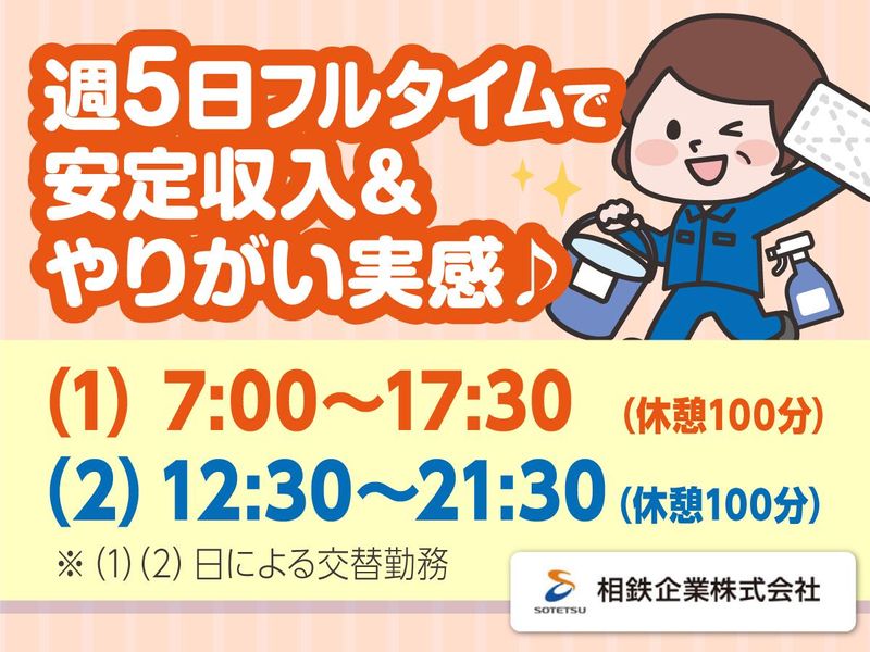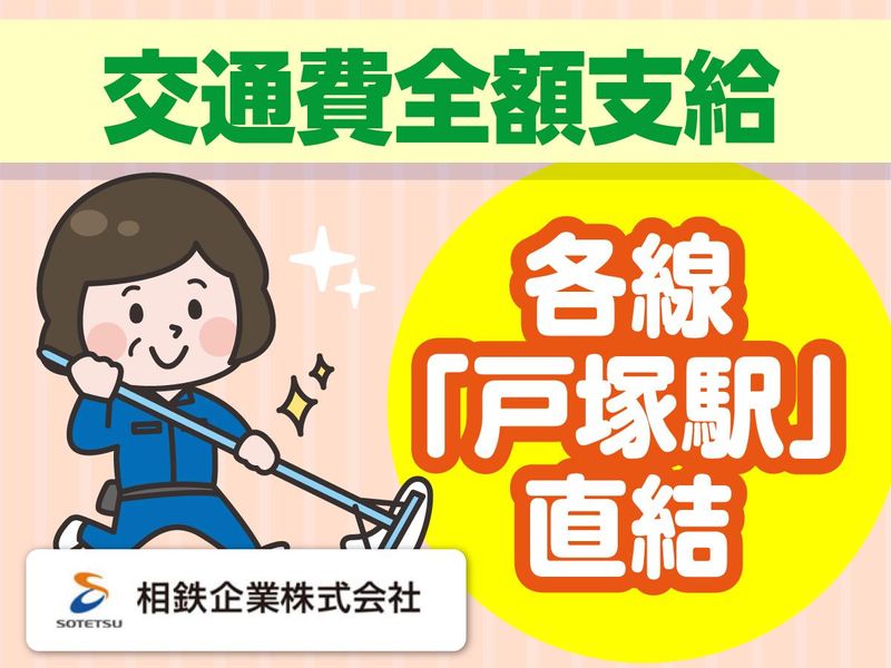 仕事内容 ・…━━★☆・…━━★☆・…━━★☆ ≪未経験歓迎≫ 40~60代の女性活躍中! フルタイム勤務でしっかり稼げる♪ ・…━━★☆・…━━★☆・…━━★☆ ┌────┐ 注目POINT! 【 トツカーナモール 】 └○───┘ ゜ ✅経験不問!未経験も経験者もみんな歓迎◎ ✅駅直結!通勤楽々&便利なモール勤務◎ ✅交通費全額支給!通勤費の負担ナシ◎ ✅長期安定!大手企業で安心して稼げる◎ ⌒-⌒-⌒-⌒-⌒-⌒-⌒-⌒-⌒-⌒-⌒-⌒-⌒ ▼ お仕事について  ̄ ̄V ̄ ̄ ̄ ̄ ̄ ̄ 商業施設【トツカーナ】での 清掃業務をお願いします。 ● 具体的に…  ̄ ̄ ̄ ̄ ̄ ̄ ̄ *掃き・拭き掃除 *モップ掛け *ごみ回収 *トイレ清掃(男性・女性用) など ■勤務時間  ̄ ̄ ̄ ̄ ̄ ̄ (1)7:00~17:30(休憩100分) (2)12:30~21:30(休憩100分) ※上記、日によって交替勤務/週5日勤務 ⌒-⌒-⌒-⌒-⌒-⌒-⌒-⌒-⌒-⌒-⌒-⌒-⌒ 〇充実の研修制度 未経験の方でも安心のサポート体制◎ ベテランスタッフが多く在籍しているので わからないことや困ったことがあれば いつでもフォローに入ります! 〇戸塚駅直結 駅直結のモールだから 通勤が楽々続けやすい& 仕事前や後にお買い物ができて便利♪ ⌒-⌒-⌒-⌒-⌒-⌒-⌒-⌒-⌒-⌒-⌒-⌒-⌒ / スタッフの声~!50代女性 \ 子どもが成人し、子育てが終了したので 何か始めたいなと求人票を眺めていました。 「何か得意なことを活かしたい…」と考え 長年培った掃除スキルが活きるかもと 清掃の求人に応募しました。 家事での掃除は得意でしたが、 清掃の仕事の経験は無いうえに 資格もないので少し不安でしたが、 丁寧な研修と先輩のサポートで すぐに慣れることが出来ました! 久しぶりの社会復帰で不安もありましたが、 フルタイムでガッツリ稼いでます! 適度な運動にもなって運動不足解消です! 駅直結のモールで通勤が楽ですし 仕事終わりに買い物ができるので 楽しみながら続けられています♪ ⌒-⌒-⌒-⌒-⌒-⌒-⌒-⌒-⌒-⌒-⌒-⌒-⌒ ============ 相鉄企業株式会社について ============ 昭和36年、ビルの清掃管理業務を メインに設立。 現在は従業員数約2000人の規模に成長し、 鉄道会社を母体とした相鉄グループの 企業という安定性があります。 ビルメンテナンス業の他、 環境サービス業・設備工事業 指定管理者業務・不動産賃貸業なども行い、 生活に密着したサービス お客さまのニーズを捉えた 裾野の広いサービスを提供し、 地域社会の発展に貢献しています。 ⌒-⌒-⌒-⌒-⌒-⌒-⌒-⌒-⌒-⌒-⌒-⌒-⌒