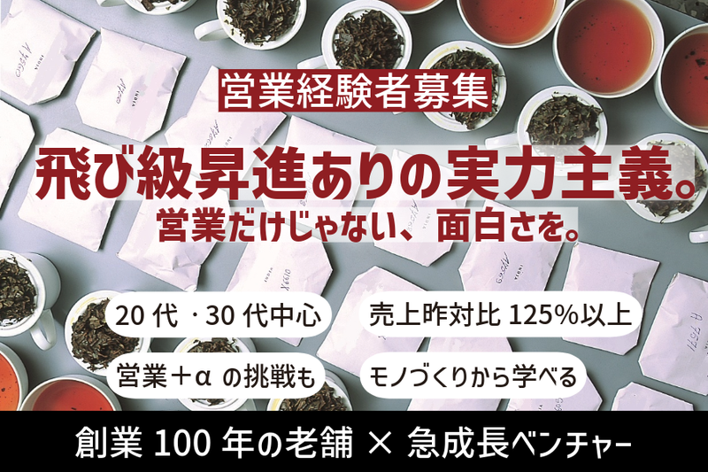 求めている人材 20代・30代が中心に活躍している職場です◎ <必須条件>  ̄ ̄ ̄ ̄ ̄ ̄ ̄ ̄ ̄ ✅大卒以上 ✅普通自動車運転免許(AT限定可) ✅営業経験(業界・商材・年数不問) ✅KPI(目標数値)を追って、 成果を上げた経験 <こんな“あなた”と働きたい!>  ̄ ̄ ̄ ̄ ̄ ̄ ̄ ̄ ̄ ̄ ̄ ̄ ̄ ̄ ̄ ̄ ✅現状の評価や待遇に満足せず、 もっと上を目指したい方 ✅食品業界や、 紅茶の持つ可能性に情熱を持てる方 ✅安定よりも、 会社の成長と共に、 自らも成長したい方 ✅商品企画やマーケティングにも 挑戦したい方