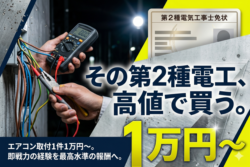 求めている人材 【応募要件】 ✅第二種電気工事士資格をお持ちの方 【歓迎条件】 ✅エアコン・家電取付の実務経験者 ✅即戦力としてご対応いただける方 【こんな方に最適】 ✅安定した案件で継続的に稼働したい方 ✅経験を活かし収入アップを目指したい方 ✅責任感を持って施工対応できる方 <<< 電話応募も受付中 >>> TEL:【043-312-3571】 ご不明点や不安なことがあれば お気軽にご連絡ください!