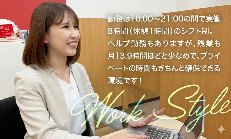 勤務時間・曜日: シフト制で勤務します。 実働時間は10時~20時の間で、休憩時間は1時間です。 残業は状況に応じて発生する場合がありますが、平均的には月に10時間程度です。 フレキシブルな勤務が可能で、プライベートとの両立もしやすい環境です。