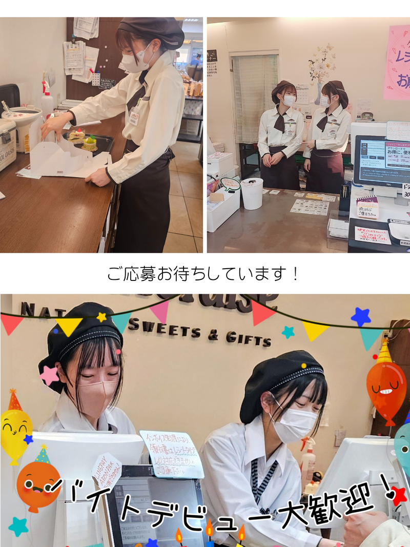 仕事内容 ☆彡。・☆彡。・☆彡。・☆彡。・☆彡。・☆彡 初バイト歓迎!無理のないシフトを 組むので学業との両立もバッチリ◎ ☆彡。・☆彡。・☆彡。・☆彡。・☆彡。・☆彡 接客、レジ業務をメインに 品出し、閉店作業をお願いします。 閉店作業…ケーキの片付け、商品補充、掃除など。 自動レジなので お釣りの受け渡しがなく安心です◎ \初めてのバイトデビューを積極応援中!/ ◆高校生、大学生…大歓迎! ◆未経験でも大丈夫!ひとつひとつ丁寧に教えていくので安心してくださいね。