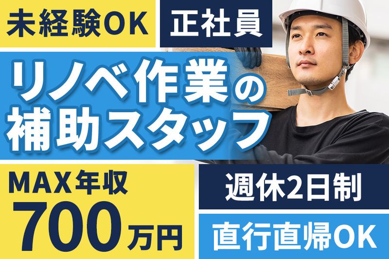 【アピールポイント】 \難しい作業はナシ!/ リノベ工事の手元作業員スタッフを正社員募集! ▶未経験OK・年収700万円目指せる・学歴不問◀ 若手活躍の職場でキャリアアップしませんか? ※60歳未満の方(例外事由1号)限定※