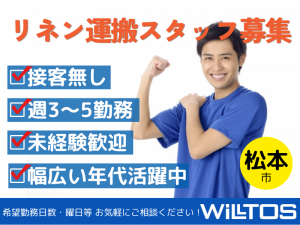 インフォメーション *未経験者歓迎!!体を動かすことが好きな方にぴったり!健康維持や運動不足解消にも◎* 週3~5日ご勤務いただける方大募集! ☆未経験者活躍中 ☆50代・60代の男性スタッフも活躍中! ☆大学生・専門学生にぴったり ☆ミドル世代活躍中 ☆扶養内勤務可 ☆チームでのお仕事 ☆通勤手当支給(当社規定による) ☆受動喫煙防止措置あり ~~~~~~~~~~~~~~~~~~ お電話でのご応募も受け付けています!お気軽に、まずはお電話ください♪ 応募受付TEL 0120-160-086 ~~~~~~~~~~~~~~~~~~ アピールポイント ☆未経験者活躍中 未経験から始めたスタッフが90%以上! 研修も充実しているので安心して始めていただけます☆ 家事の延長でいかがでしょうか? ☆高校生・大学生可 接客はありませんので黙々と、 サクッとおこづかいが稼げます♪ ☆ミドル・主婦・主夫さん活躍中 昼間のお仕事なので お子さんのお迎えにも お夕飯の準備にも間に合います♪ ☆チームでのお仕事です 仕事自体は一人の時間が多いですが チームで分担して行っており リーダーや担当社員もいるので 安心して働けます。 急なお休みやシフトの交代なども、お互いに協力し合っています。 長くお仕事を続けられるように、みんなで工夫しています。 ☆労災保険完備 万が一のことがあっても安心! ☆扶養内勤務 ☆受動喫煙防止措置 請負のお仕事なので勤務地での喫煙は禁止です。 当社は創業40余年。パートナー社員の方を中心に約950名の方が働いています。 パートナー社員の方々に支えられ当社もここまでこれました。 これからもたくさんのパートナー社員の方々と共に、お客様の利用される空間をより清潔で快適な環境を提供し続けていきたいと思っております。 皆様も是非ウィルトスで一緒に働きませんか?