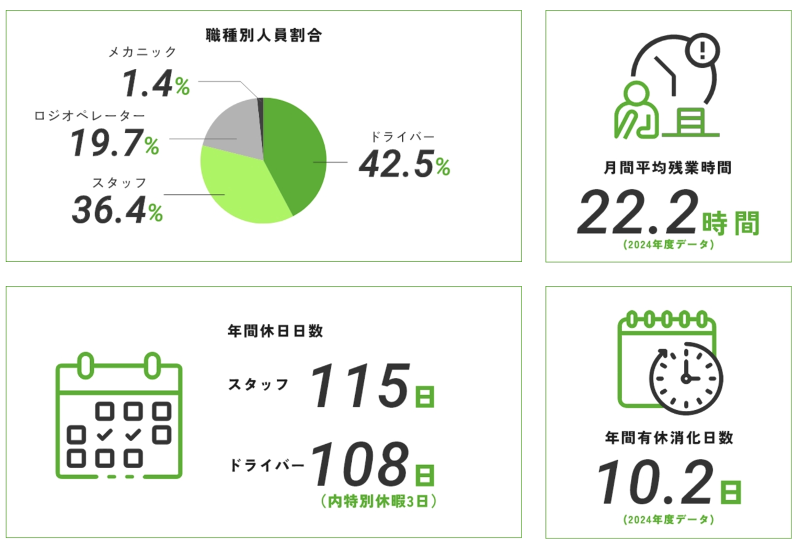 勤務時間・曜日: <変形労働時間制> 8:30~17:30 ※運行により異なります。詳細は面接時ご説明します。
