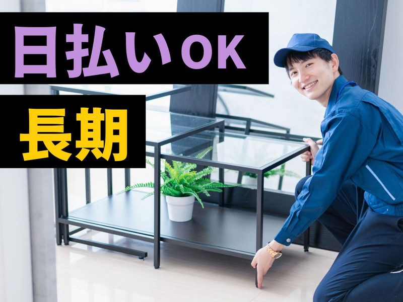 仕事内容 ✅じっくり働ける長期★日払いOK! ✅履歴書不要!応募⇒勤務もスグ! ✅未経験OK!知識や経験は一切不要 ✅グループ作業!協力して進めます ✅友達同士でのご応募も歓迎します ✅選べる勤務時間!日勤・夜勤など ✅半日(4時間)勤務など融通もOK! ▰▱▰▱▰▱▰▱▰▱▰▱▰▱▰▱▰▱ ⭐仕事内容  ̄ ̄ ̄ ̄ ̄ ̄ 学校や各種施設を対象とした 各種家財の搬出・搬入をお任せ♬ <仕事の流れ> ▼営業所へ集合 ▼現地へ向かう(車移動) ▼机・椅子・棚などの搬出 ▼移転先へ搬入し、設置 ―――大まかにこんな流れです! 作業はすべて一人ではなく チームで行いますので安心✨ ▰▱▰▱▰▱▰▱▰▱▰▱▰▱▰▱▰▱ ⭐長期でしっかり稼げる!  ̄ ̄ ̄ ̄ ̄ ̄ ̄ ̄ ̄ ̄ ̄ ̄ ̄ フルタイムの8時間勤務から 半日の4時間勤務も可能です! 「午前メイン」 「お昼過ぎから」 「夕方から」などなど、 時間帯の相談も遠慮なくどうぞ! ▰▱▰▱▰▱▰▱▰▱▰▱▰▱▰▱▰▱