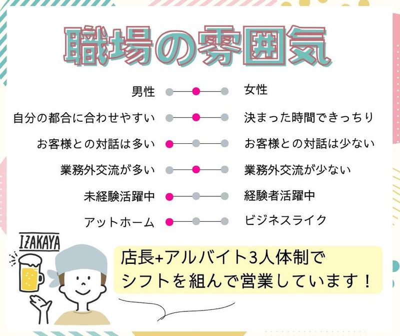 職場環境 「お!新人さんか~!頑張ってこ!」とお客さんに可愛がってもらいながら 卒業まで続けるスタッフも多いです★ 店長さんの程よいゆるさも居心地良く楽しく働けるポイントです◎