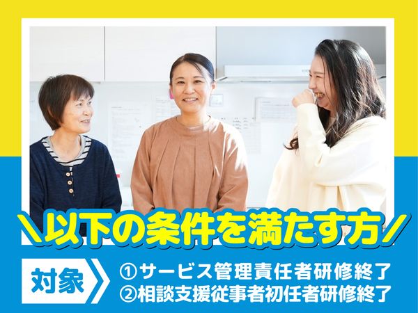 応募資格 学歴不問・経験不問 \以下の条件を満たす方/ ➀サービス管理責任者研修修了 (または児童発達管理責任者研修修了) ➁相談支援従事者初任者研修修了 (または相談支援従事者実務者研修修了) ➂普通自動車運転免許(AT限定可) 経験の有無よりも、人柄重視。 目の前の人を思いやれる、その気持ちさえあれば素質は十分です。 20代30代40代50代60代の幅広い年齢の男女スタッフが活躍中!