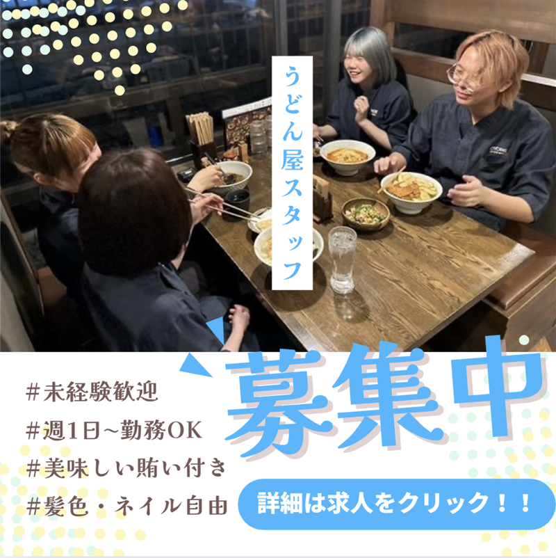 平日夜と土日に働けるうどん屋のホールスタッフ