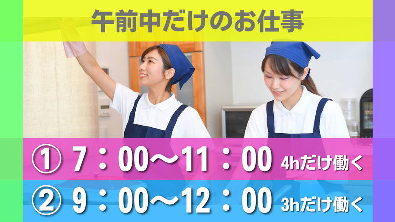 固定時間制 勤務時間詳細 ▼下記時間シフト制 <歓迎> 07:00~11:00(実働4h) 勤務できる方歓迎 <対応可> 09:00~12:00(実働3h) 勤務できる方 ※平日週2~3日シフト制(曜日応相談)
