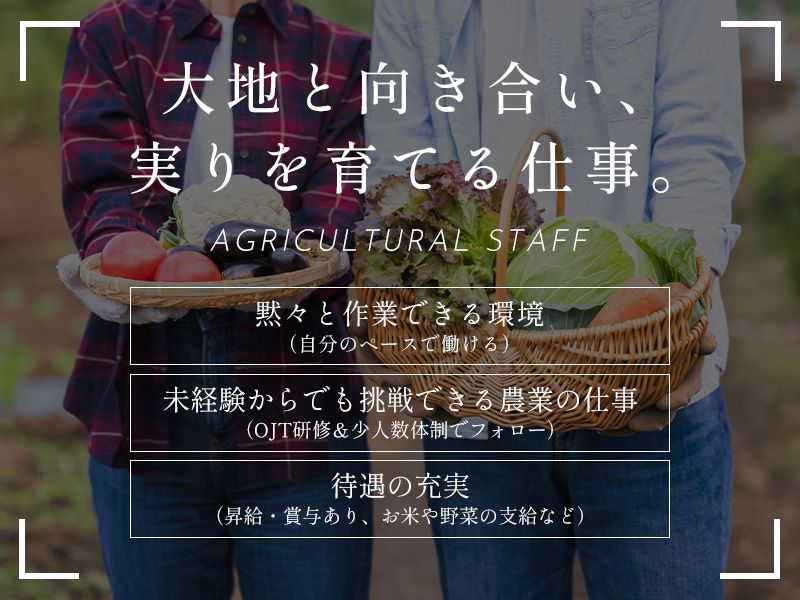 仕事内容 未経験から挑戦できる【農業スタッフ】 <こんなところが魅力的!> ✅お米、野菜支給あり ✅夏場は飲み物支給あり ✅空調服や防寒着支給あり 【 お任せする仕事例 】 □肥料撒き、草刈り □野菜や花、麦や米の収穫 □米・麦の乾燥調整の袋詰め □トラクター、コンバインによる収穫 □農業用ハウスの建設、加工 □トラクター、コンバインによる収穫 □農業用ハウスの建設、加工 など••• ⇒農作業全般のお仕事をお任せ! 【 こんな作物を育てます 】 <お米> ミルキークイーン コシヒカリ、キヌヒカリ きらりもち麦など••• <そのほかにも•••> 菊、ラディッシュ、サンチュ レタス、椎茸、ヒラタケなど••• \少人数体制でフォローもばっちり / ✓OJT研修による教育制度 ✓代表がしっかりと指導 ✓資格取得支援あり! ⇒半年ほどで手に職がつけられる!