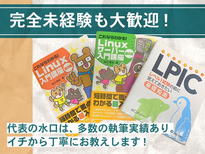 仕事内容 \\ 今年2月OPENの新オフィス! // ―――――――――――――――――― 今年の2月に出来たばかりの新オフィスでの募集! 駅チカ好立地のキレイなオフィスで働きたい方はぜひ! \\ 無資格・未経験大歓迎 // 現在働いているスタッフの90%以上が未経験から入社!前職は、コンビニ店員・自衛隊・陶芸家など様々。 チームの一員として、安心感を持ちながら共に成長できる場が待っています! 10名以上の大口募集ですので、ほぼ同期として一緒にスタートできますよ◎ ――――――――――――――― 具体的な仕事内容 ――――――――――――――― システムエンジニア(SE)として、サーバーの設計・構築(開発)・運用・監視・保守をお願いします。 <詳しくみると…> ■設計 ┗顧客要望をもとに、「どんなシステムを作るか」を検討。システムの機能・性能・使いやすさ等を設計書にまとめていきます。 ■構築(開発) ┗設計書に沿って、サーバーを構築していきます。シェルスクリプト、Python、Rubyなどのプログラミングを行い開発する場合もあります。 ■運用・監視・保守 ┗サーバーが安定して動くように、監視・メンテナンス・修正などを行います。 また、より使いやすくなるようにシステムのアップデートや機能追加も行います。 <現場環境は…> 常駐先での勤務になりますが、案件によっては社員2~3名のメンバーで常駐先で対応する案件もあります。 基本的には常駐先でも質問・頼れる環境をつくっているので安心です。 ※扱うサーバはLinux・Windows両方あり ★ゆくゆくは、サーバ・ネットワーク・システムの設計・構築・運用・監視等、エンジニアとして幅広い仕事に携わりながら、あなたの適性や将来なりたい姿に合ったキャリア設計を一緒にみつけていきましょう! ━━…━━…━━…━━…━━…━━ ■2~3年かけて1人前に! 充実した学習制度を利用し、エンジニアとして一から成長できます。大規模インフラの構築案件等、技術的に高度な仕事に挑戦するチャンスも豊富です。 シェルスクリプト、Python、Rubyなどのコードも書くことがあり、将来プログラマーを目指す第一歩にも! ■学習制度について 社内勉強会や社外の人も招いて開く様々な技術分野に関する勉強会も随時実施!常に業界の最先端の技術を学び続けることができます。 ■未経験でも即時昇給アリ 現場での評価を得て、単価が上がった場合は即時昇給で給与に反映! 未経験でも活躍した分だけ即時に給与に反映されます◎ ■リモート・フルリモート案件も多数◎ 週4日リモートの案件や、完全在宅勤務の案件も! あなたのライフステージに合わせて働けます! ――――――――――――――― 入社前後の流れ ――――――――――――――― エンジニア技術書の執筆実績もある代表の水口が、2~3ヶ月かけてマンツーマンで基礎からお教えします! 現場に出てからも、常に上司や先輩がフォローするので安心して仕事に取り組める環境です。 監視→運用(保守)→構築→設計と、少しずつステップアップしていきましょう! ※経験者の方には、各自のスキルに応じて最適な仕事をお任せします。希望があればぜひお伝えください。 ――――――――――――――― 当社について ――――――――――――――― ■当社代表の水口克也は、インフラ構築・運用の豊富な実績を持つLinuxのスペシャリスト。 IT専門の出版社から依頼を受けての執筆実績も多数あります。 2009年にLinuxジャパンを創業してからは、技術者の育成に努めると共に、幅広い業界の大手企業のインフラ開発やアプリ開発プロジェクトを手がけてきました。 その技術力・人材育成力が評価され、おかげさまで当社に寄せられる案件も順調に増加しています。