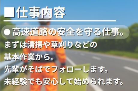 仕事内容 \未経験歓迎!高速道路の安全を支える仕事/ 高速道路を利用するすべての人が、安心して移動できるように。 私たちは、道路をきれいに保ち、トラブルが起きた時に対応する仕事をしています。 「難しそう…」と思うかもしれませんが、 未経験から始めたスタッフも多数在籍中。 チームで動くため、一人で抱え込むことはありません。 ■ 仕事内容 高速道路を安全で快適に保つため、次のような作業を行います。 - 路面の清掃・簡単な補修 - 事故後の復旧対応 - 作業時の交通規制(設置・撤去) - 樹木の剪定や草刈り - 防草シート・立入防止柵の設置 - 冬の雪・凍結対策 どの作業も チームで協力しながら、安全を確保して進めます。 ■ 未経験でも安心して始められる理由 - 作業はシンプルで、覚えやすい - 毎年同じ作業が多く、徐々に慣れていける - 先輩がそばでフォロー - 困った時はすぐに相談できる雰囲気 「初めての仕事が不安」という方でも、安心してスタートできます。 ■ 屋外で働く気持ちよさ 春の風、夏の青空、秋の紅葉、冬の澄んだ空気。 季節を感じながら体を動かせるのは、この仕事ならでは。 - 夏は空調服 - 冬は防寒具 など、一年中快適に働ける装備がそろっています。 チームの雰囲気も良く、コミュニケーションが取りやすい職場です。 ■ 安定した収入と安心の待遇 高速道路の維持管理は、年間を通して仕事量が安定しています。 将来を見据えて働きたい方にもぴったり。 - 冬の雪対策は高収入のチャンス(日給3万円以上も可) - 社会保険完備 - 有給休暇あり - 最低給与保障あり(アルバイト・パートも対象) 生活面も安心して働ける環境です。 ■ あなたの力を求めています 高速道路の安全を守る大切な仕事に、あなたも挑戦してみませんか。 未経験からでも、しっかり成長できる環境があります。