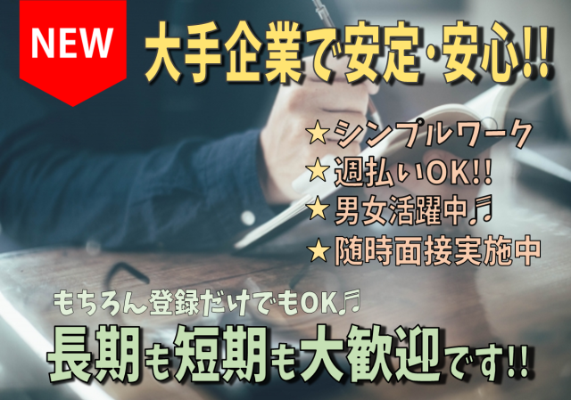 資格・経験 《経験は一切問いません》 ■未経験でも大歓迎! ■資格・学歴不問 ■フリーターさん歓迎! 《こんな方にオススメ》 ■軽作業をお探しの方 ■モノづくりに興味のある方 ■安定してしっかりと稼ぎたい方 ■未経験から頑張りたい方