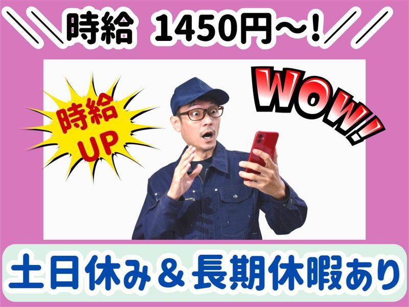 仕事内容 ✨✨✨✨✨✨✨✨✨✨ 稼ぎたい方に朗報です なんと時給100円UPしました♪ 未経験スタート大・歓・迎 ✨✨✨✨✨✨✨✨✨✨ プラスチック製品の製造加工を行うお仕事です。 具体的には、完成した製品の不要な部分をカットしたり削ったりする軽作業。 シンプル作業だから未経験者でもすぐに慣れることができ、作業手順のマニュアルも完備しているので安心して始められます。 応募資格不要!特別なスキルや知識も一切必要ありません。 分からないことは、周りの先輩スタッフに気軽に質問おっけ~◎ 優しい先輩たちがイチから丁寧に教えます。 若手スタッフはもちろん、40代・50代の中高年の方々も多く活躍中です。 高時給1450円にUPしました✨ 初月から月収33万円以上稼ぐことも可能です。 しかも土日休みで休日にしっかりリフレッシュ可能◎ ワークライフバランスを大切にしたい方もぜひご応募ください! ✅未経験者が多数活躍中! ✅専任担当もいる働きやすい職場 ✅定着率ばつぐん! 職場見学OK!実際の作業場を見て応募できます◎お気軽にご相談ください。