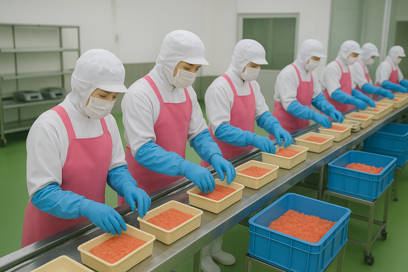 食品工場内での冷蔵食品の小分け・検品・箱詰め