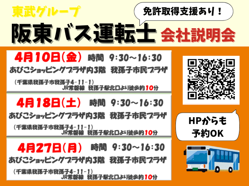 仕事内容: 【我孫子市内での勤務です】 / 「今の仕事はハードすぎる…」 「落ち着いた雰囲気で働きたい」 50代の方も歓迎♪ あなたのセカンドキャリアを応援します! \ ⭐入社支度金最大10万円支給⭐ ※経験者10万円、未経験者7万円 ⭐未経験からバス運転士に⭐ 普通免許で応募OK! 運転士養成制度を利用して 大型二種免許が取得可能です♪ ========================== \会社説明会、実施中⭐/ この求人に応募いただいた方に、 ご案内しております。 「やっぱり辞めとこう」となっても、 大丈夫です◎ ■まだ前の仕事を辞めていない ■ボーナスをもらってから転職を考え中 ■入社は4月から考えている そんな方でも大丈夫♪ 入社時期は柔軟に対応いたします。 ぜひお気軽にご応募ください♪ 電話でも応募受付中! 「indeedを見た」とご連絡ください! ▶04-7185-2771 ========================== ----------------------------- \安定の東武グループ⭐/ 当社は東武鉄道のグループ企業です 【仕事内容】 路線バスの運転士募集! 我孫子市全域と柏市の一部を 担当していただきます! 【具体的な業務内容】 ・ドライバー業務 ・出発前のバス点検 ・伝達事項のチェック ・出発点呼 ・帰着時の終了点検 など ---------------------------------- / 免許取得後の流れ \ 【入社~3日間:座学】 ・入社手続き ・接客講習 ・点検方法 など 【4日目~10日目:実技】 ・指導運転手が同乗♪ ・お客様を乗せないフリー走行 ・車庫において前進、後退訓練 ・運行路線の把握 【~1か月半:実践】 ・指導運転手が同乗♪ ・お客様を乗せた実践訓練 ・駅ロータリやバス停への対処法 約1か月半で独り立ちとなりますが、 教育期間の延長もあるので安心です⭐ ※経験者の場合は、 約1か月で独り立ちとなります。