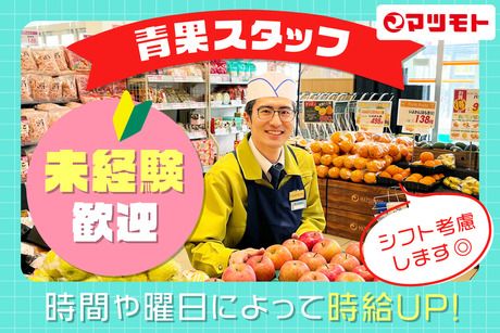 仕事内容 【 仕事内容 】 ■野菜や果物の品出し・陳列 商品をキレイに陳列(売場つくり) ※商品の鮮度チェックや入れ替えなど ■カット・袋詰め作業 カット野菜やフルーツのパック詰め・ラベル貼りなど ※難しい作業は社員がフォローします! ■値引きやPOPの貼り替え 特売や時間帯にあわせてラベルを変更 ■売場の清掃(陳列棚の拭き掃除や床の清掃など) 【 アピールポイント 】 < 時給アップ > 日祝・・・・ +100円 8時以前・・・+200円 17時以降・・+200円 地域の方に愛されるスーパー「マツモト」 京都・大阪を中心に展開する地域密着型のお店です! 明るく元気なスタッフが多く、職場の雰囲気も◎ アルバイトが初めての方でも安心して始められます。 シフトは柔軟に対応OK!学校や家庭とも両立しやすい! 品出し・レジ・惣菜など、希望に合ったお仕事をご用意。 自分に合ったポジションで、無理なく働けますよ♪ 【 アクセスの仕方 】 ◆近鉄「小倉駅」より徒歩約10分 ※小倉駅「東出口」の改札です ※店舗は大きな駐車場が目印です!