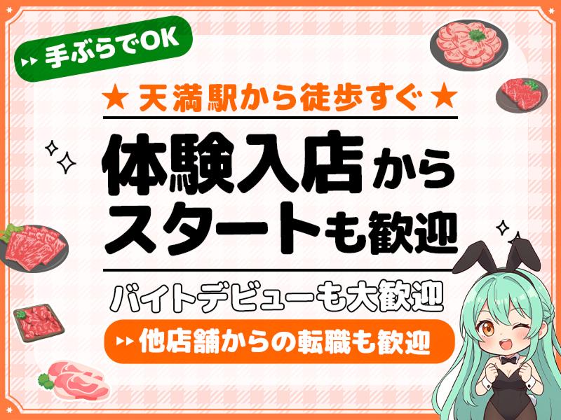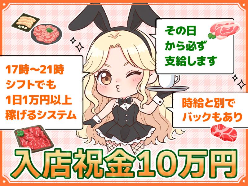 アピールポイント: ✅大阪・天満エリアにGRAND OPEN 「焼肉×バニーガール」の激レアスポット誕生! スタッフ全員が同期の「第一期生」として、 まっさらなお店を一緒に盛り上げませんか? ✅オープニング限定!時給5,000円 今だけ!未経験でも時給5,000円スタート! さらに、各種高額バックや入店祝い金も◎ 17時〜21時の早めシフトでも、 1日1万円以上稼げるシステムです! ✅シフトは超自由 「学校帰りにサクッと」「Wワークで夕方から」など、 17時オープンだからこそ叶う働き方があります! 週1日・1日3h~OK!終電上がりももちろんOK! ✅「自慢の焼肉まかない」付き なんと、まかないでお店自慢の焼肉が食べられます! 食費を浮かせたい学生さんや、 お肉が大好きな子には最高の環境です!