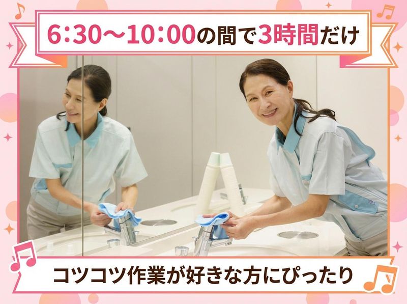 仕事内容 \ここがポイント!/ ✅未経験スタート大歓迎✨ ✅月・水・金・日の週4日勤務 (第一月曜及び年末年始は休み) ✅6:30~10:00の間で3時間勤務 ✅主婦(夫)さん活躍中! ✅ミドル・シニア世代も活躍中 ✅トイレ清掃あり(女子トイレを含む) ✧・…………………………………・✧ 【 お仕事内容 】 公共施設内の清掃業務をお任せします! ▽具体的には… ・フロアの掃除機がけ (通路・ロビー・会議室など) ・トイレ清掃(女子トイレも含む) ・給湯室や休憩スペースの清掃 ・ゴミの回収・分別 ・消耗品の補充 (トイレットペーパーなど) 一人作業なので自分のペースで進められ、 道具も整っているので未経験でも安心♪ 「いつもきれいにしてくれてありがとう!」 の言葉がやりがいにつながります。 ✧・…………………………………・✧ 【 お仕事の魅力ポイント 】 ⭐ 朝の3時間だけの勤務♪  ̄ ̄ ̄ ̄ ̄ ̄ ̄ ̄ ̄ ̄ ̄ ̄ ̄ 6:30~10:00内で3時間、 月・水・金・日の週4日勤務だから、 朝のスキマ時間にサクッと働けます。 無理なく自分のペースで働けるので、 朝の時間を有効活用したい方に ピッタリです! ⭐ 主婦(夫)さん活躍中♪  ̄ ̄ ̄ ̄ ̄ ̄ ̄ ̄ ̄ ̄ ̄ ̄ ̄ ̄ 家事や育児の合間に働く方も多く、 無理なく自分のペースで勤務できます。 分からないことも気軽に相談でき、 助け合いながら働ける環境です◎