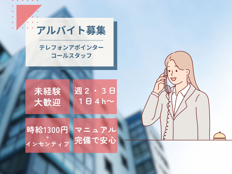 求めている人材 ✅マニュアル完備なので未経験でも安心です! コールセンターやカスタマーサポート、営業職(営業事務)の 経験がある方はスキルを活かすことができます♪